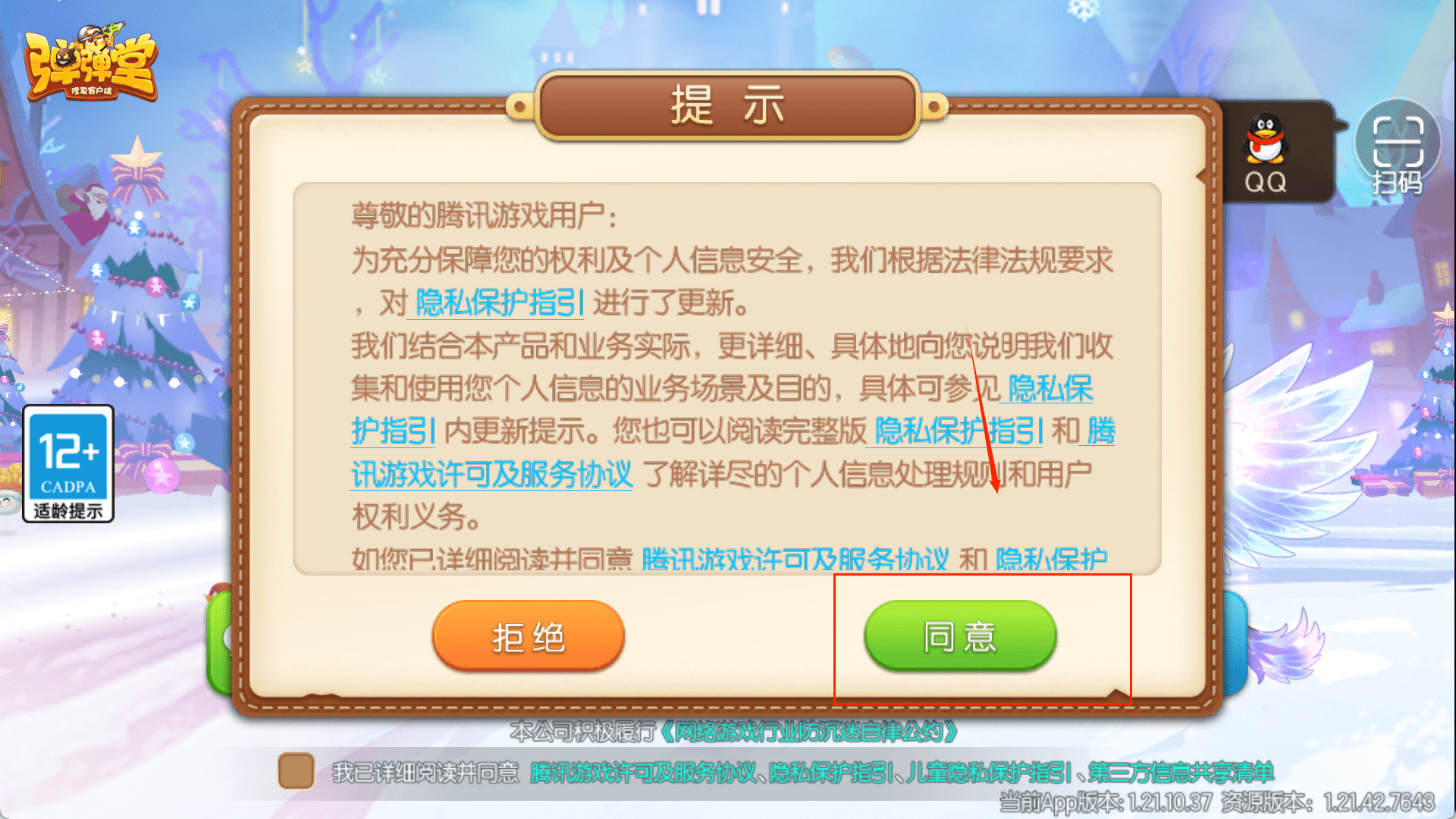 1、进入游戏,首先弹出的是关于隐私保护指引的提示框,边框设计独特。你应该认真阅读框内的文字内容,了解更新情况,然后在提示框的最下方,点击那个颜色较深的“同意”按钮。