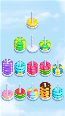 叠圈拼图,这款游戏的关卡很多,类似于倒水的玩法机制,玩家同样要考虑好先后顺序,将这些甜甜圈按照颜色进行分开处理。游戏难度会随着甜甜圈颜色增加而加大,越到后面,挑战性更强。