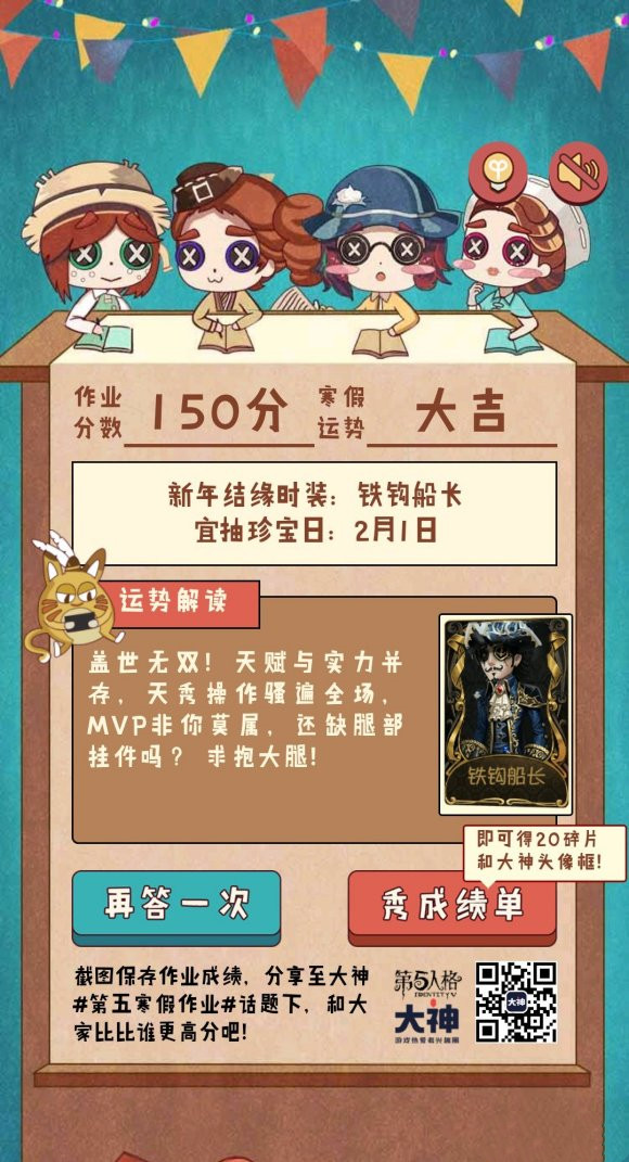 2020寒假作业答案大全。就目前来说很多玩家都不是太清楚新出的今年的寒假作用的答案,很多玩家都在找本作今年的寒假作业答案。下面就和小编一起来看看2020寒假作业答案汇总吧。第五人格2020寒假作业答案大全完成,在「大神」带#第五寒假作业#话题,晒出你的寒假作业分数,即可获得“碎片×20”!答题达到满