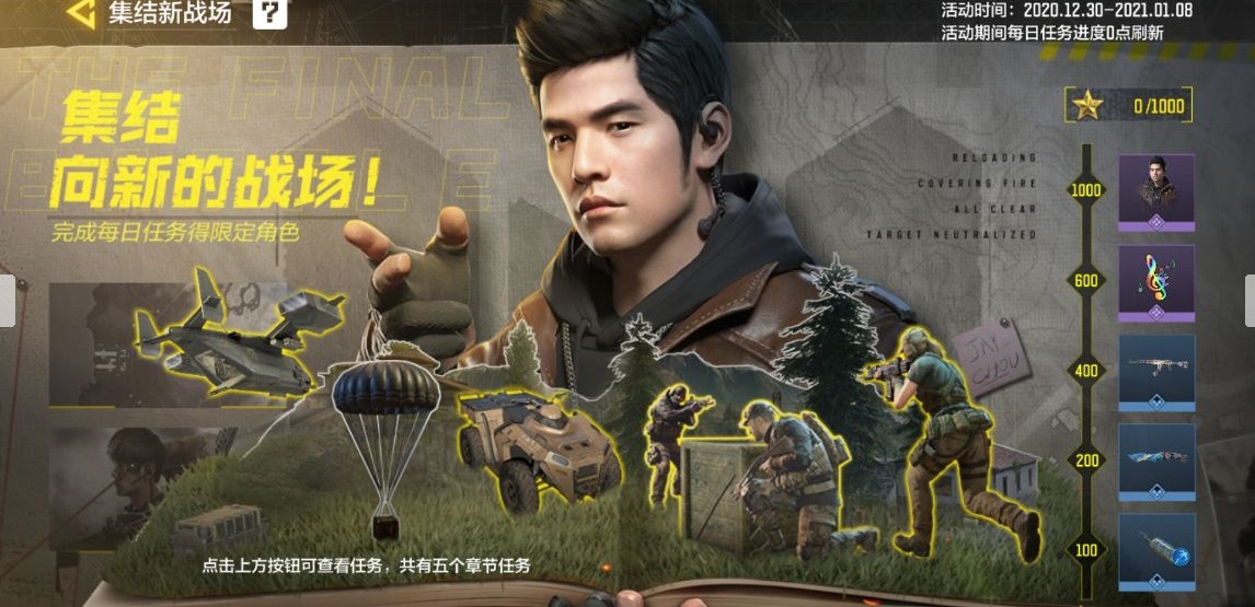 使命召唤手游周杰伦jaaay怎么获得?很多玩家们都很期待周杰伦这个联动角色,但是怎么样能够快速的攻略呢?其实玩家们只要看到了小编给大家准备的攻略方法,已经是不难的,下面就来看看怎么样免费获得吧!需要参与这个集结新战场的活动,然后通过完成任务,获取1000点积分,就可以顺利得到这个周杰伦了。主要有五个
