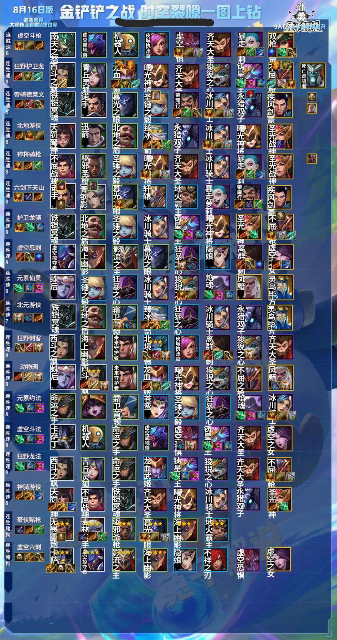 金铲铲之战虚空斗法阵容搭配中为大家带来了强力的虚空斗法阵容玩法搭配攻略,这里可以看到清晰的虚空斗法阵容英雄搭配、英雄出装信息以及阵容的站位信息,让玩家可以更好的了解虚空斗法阵容的玩法。