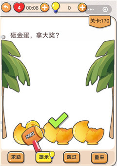 我不是猪头第170关怎么过?我不是猪头关卡170是一个砸金蛋的游戏,但是这些金蛋怎么砸都砸不碎,要怎么拿奖呢?下面就是我不是猪头关卡170拿大奖攻略了,想要拿大奖的小伙伴们都来看看吧!我不是猪头第170关怎么过问题:砸金蛋,拿大奖?答案:用锤子一个一个砸》》》我不是猪头攻略答案大全《《《(点击进入)