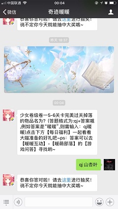 少女卷级卷一5-6关卡完美过关掉落的物品名为?奇迹暖暖在本次周游戏更新后会上线许多新的主题搭配玩法,届时需要玩家熟悉的掌握各种装饰的属性来快速高分通关,快去领取公众号答题福利吧。奇迹暖暖2018年11月20每日一题问题少女卷级卷一5-6关卡完美过关掉落的物品名为?(答案各式为qj+答案哦,例如答案是