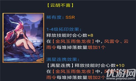 神都夜行录云胡不喜怎么样?云胡不喜是神都夜行录游戏中的拓印,该拓印能让玩家在金风玉雨鱼龙夜的风雷令与云雨令的掉落数量。玩家也许对这个拓印的能力不是很熟悉,下面小编就给大家介绍下。神都夜行录云胡不喜介绍云胡不喜稀有度:SSR升星前效果:释放技能时会心数+8满星连携效果:在金风玉雨鱼龙夜中,风雷令、云雨