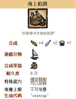 饥荒海难海上陷阱,怎么做,和具体的用法,可能还有小伙伴还不知道吧。今天小编就给大家讲讲有关海上陷阱的使用还有制作方法,有不清楚的小伙伴,和小编一起来看看吧。海上陷阱(SeaTrap)是船难DLC中航海类的制作项目。用来捕捉龙虾,但不能捕捉宽吻海豚,水母,或狗鱼。它需使用科学仪器解锁,材料为4个棕榈叶