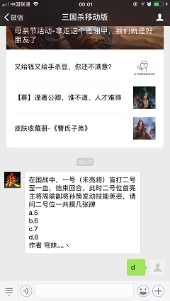 在国战中,一号(未亮将)盲打二号至一血,结束回合,此时二号位首亮主将周瑜副将孙策发动技能英姿,请问二号位一共摸几张牌,这是三国杀微信公众号2018年5月14日每日一题问题,今天的答案是不是还有好多小伙伴不知道的,小编这就为大家分享下在国战中,一号(未亮将)盲打二号至一血,结束回合,此时二号位首亮主将