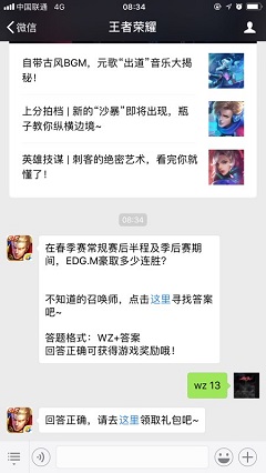 在春季赛常规赛后半程及季后赛期间,EDG.M豪取多少连胜?这是王者荣耀微信公众号上2018年7月7日每日一题问题,今天的答案可是有点难度的哦,小编这就为大家分享下在春季赛常规赛后半程及季后赛期间,EDG.M豪取多少连胜答案,希望对大家有帮助。2018王者荣耀7月7日一题问题在春季赛常规赛后半程及季后