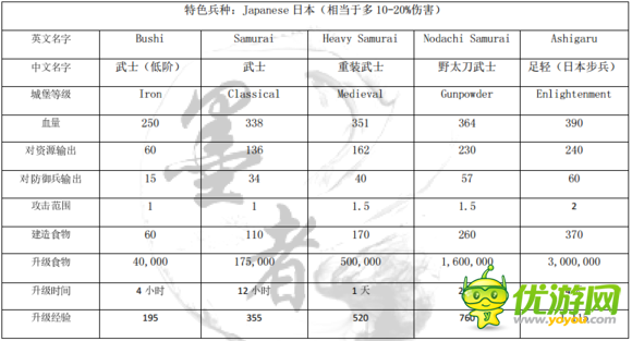 文明争战日本国家文明怎么样;文明争战日本国家文明分析;日本国家文明优点:1、特色的步兵2、被攻击后护盾时间加长3、基地可以攻击总结:日本拥有特色步兵,攻击加成20%,攻击最强的步兵,而且被攻击后有超长乌龟壳,适合后期的发展,基地可以攻击,相当于多了一个箭塔下列为日本文明,从左到右依次升级顺序,详情请