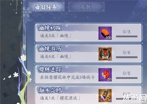 阴阳师雪落樱祭试炼活动怎么玩?体验服最新开启的【雪落樱祭】活动一共有4个玩法,试炼就是其中一个,我们完成试炼中的每日任务就能解锁成就奖励了。下面就让我们一起来看看雪落樱祭试炼每日任务及成就奖励介绍吧!阴阳师雪落樱祭试炼活动怎么玩每日任务解谜者1.通关三次幽境:100体力2.通关六次幽境:5个随机六星