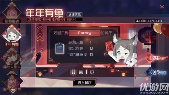 永远的7日之都年年有鱼怎么玩?年年有鱼是永远的7日之都游戏中在春节上线的一个活动,玩家需要制作美食增加店铺经验和提升店铺等级。下面小编就来给大家详细的介绍下活动玩法。永远的7日之都年年有鱼玩法攻略年年有鱼新春到,放鞭炮,中央庭的餐厅又盛大开业啦。和白一起经营餐厅,让大家度过一个美食不断的春节吧!活动