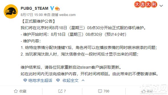 绝地求生8月18号更新到几点