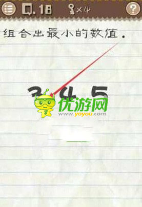 最囧游戏2第18关怎么过?;最囧游戏2第18关怎么通关;最囧游戏2第18关通关攻略;最囧游戏2第18关怎么过?【第18关通关攻略】标题题目:【组合出最小的数值.】,然后就是给出我们三个数字,他们分别是3、4、5看完这个题目和数字之后大家可能就马上就组合出了数字345,然而让大家感到意外的是当大家组合