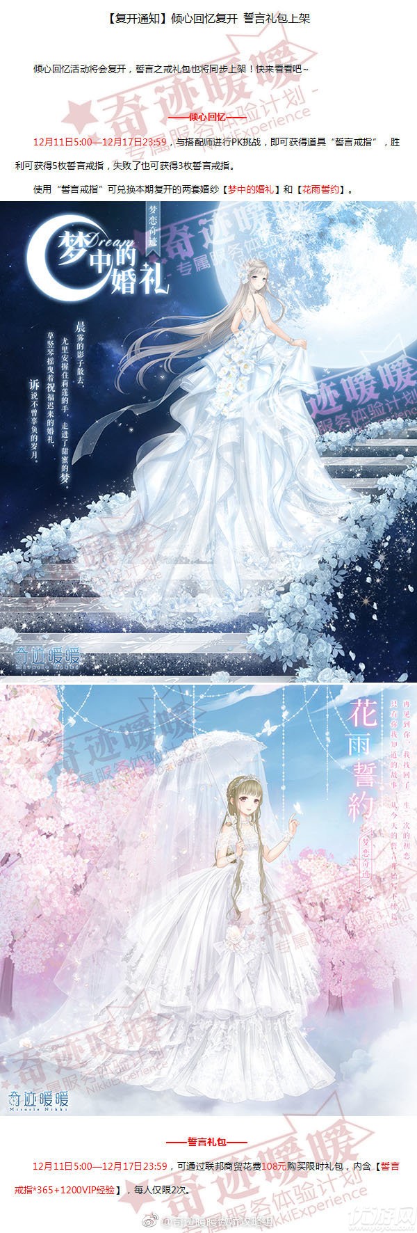 奇迹暖暖倾心回忆明日复开!12月11日倾心回忆再度开放,梦中的婚礼和花语誓约两天婚纱复开,誓言礼包上架,内有365个誓言戒指,价格为108元每人仅限购买两次!来看看本次奇迹暖暖倾心回忆活动详情吧。爆个料就走,婚纱复开?(估计没人关注?)