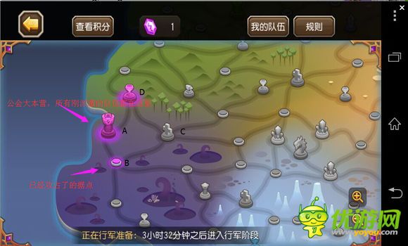 刀塔传奇圣域之战进攻教程攻略,刀塔传奇圣域之战怎么攻打别人,具体操作如下:还是这个图,公会有人想到C据点,但是C还未占领,这时候就需要我们去进攻了,那么情况来了,点开C,点详情,没有进攻符号~!那么究竟是怎么进攻的呢?方法和移动篇操作一样区别:要进攻C必须先把队伍驻扎在B或者D,然后才能对C发动进攻