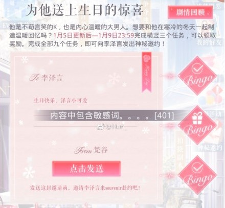 恋与制作人邀请函内容中包含敏感词401,相信有玩家有遇到过吧。那么应该怎么做呢。今天小编就给大家分享一下,内容中包含敏感词401的解决方法,有需要的小伙伴,和小编一起来看看吧。原因就是生日快乐里的“日”是敏感词,发不出去所以不要发送带日字的就可以了~(李怼怼真是太心机了,这样就不会收到千篇一律的生日