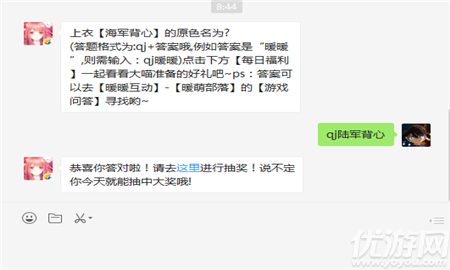 上衣【海军背心】的原色名为?奇迹暖暖微信公众号每日一题答题玩法每天都会进行不同的题目考验玩家对游戏的熟悉程度,回答正确的答案后能获得游戏给玩家提供的大量奖励,今天的答案在游戏中可以发现。奇迹暖暖2019年1月17日每日一题问题上衣【海军背心】的原色名为?(答案格式为qj+答案哦,例如答案是“暖暖”,