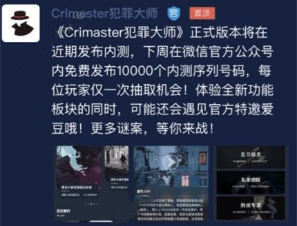 犯罪大师内测序列号码怎么获得?《crimaster犯罪大师》正式版本即将开启内测,游戏将于下周在官微发布10000个免费的内测序列号码,每个玩家都有抽取机会哦!下面就是犯罪大师正式版内测序列号码抽取技巧了,一起来看看吧!犯罪大师内测序列号码怎么获得《犯罪大师》正式版本将在近期发布内测,下周在微信公众