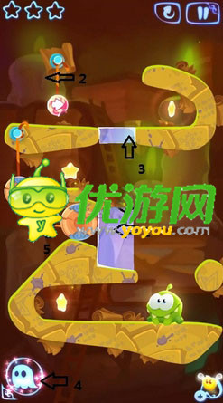 割绳子魔法第五章5-15关怎么通关;割绳子魔法第五章5-15关怎么过;割绳子魔法第五章5-15关通关攻略;先划掉箭头1的冰块让大木块拉动小木块,接着割断糖果的绳子,当它从冰块3走过去后立刻划掉冰块3。紧接着改变主角形态并割断箭头5的绳子即可。