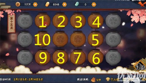 火影忍者元宵花灯第十五关怎么过?火影忍者元宵花灯活动中的第15关比较复杂,很多玩家都不知道该如何点亮所以花灯。下面就是小编为大家带来的火影忍者元宵花灯第15关通关攻略图文了,有需要的玩家拿走不谢!火影忍者元宵花灯第十五关怎么过通关步骤按照顺时针顺序,依次点击下图中标注了数字的10个花灯。》》》火影忍