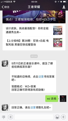 5月11日的王者音乐课中,提及了哪些经典摇滚乐器,这是王者荣耀微信公众号上2018年5月12日每日一题问题,今天的答案可是在游戏活动中就可以找到的,小编这就为大家分享下5月11日的王者音乐课中,提及了哪些经典摇滚乐器的答案,希望对大家有帮助。2018王者荣耀5月12日每日一题问题5月11日的王者音乐