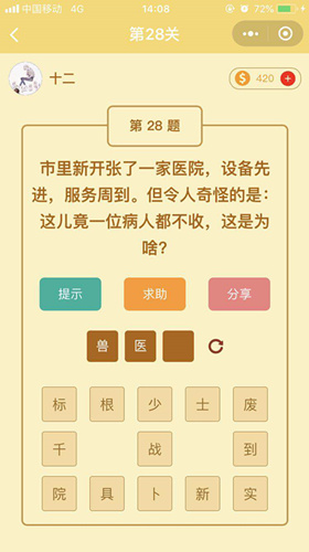 微信趣味脑筋急转弯第28关怎么过,第22关可是游戏给大家的关卡,答案可是很简单的,小编这就为大家分享下微信趣味脑筋急转弯第28关答案,感兴趣的朋友一起来看看吧!微信趣味脑筋急转弯第28关答案市里新开张一家医院,设备先进,服务周到。但令人奇怪的是:这儿竟一位病人都不收,这是为啥?兽医院