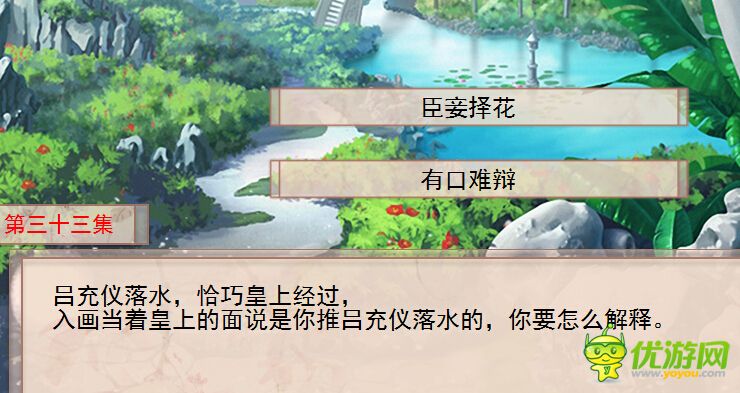你能活几集第33集怎么过你能活几集第33集攻略。小编今天给大家带来的是你能活几集第33集怎么过你能活几集第33集攻略。一起来看看!第三十三集:入画当着皇上的面说是你推吕充仪落水的,你要怎么解释选择1臣妾折花:你陷害吕充仪失败,被打入掖庭,永世不得翻身。选择2有口难辩:禁足锦乐宫,进入下一集