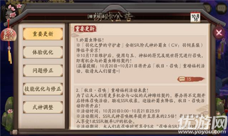 阴阳师秋日召唤活动怎么玩?这次的秋日召唤活动可以将SSR式神召唤概率提升2.5倍,那么玩家抽取到SSR妖灵的机会就大大提升了。很多玩家都估计很*这次的活动吧,下面小编就来给大家详细介绍下。阴阳师秋日召唤活动介绍为了让大人们有更多机会与心仪的式神缔结契约,寮办将不定期开启特殊召唤活动。助攻SSR收录,