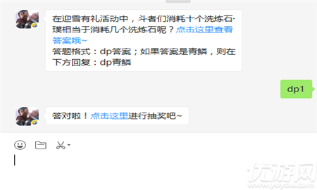 在迎雪有礼活动中,斗者们消耗十个洗炼石·璞相当于消耗几个洗炼石呢?斗破苍穹微信公众号每日一题以及更新了,今天的问题是考验玩家对装备的锻造的了解。下面小编就来给大家公布下今天的正确答案。斗破苍穹手游12月9日一题题目在迎雪有礼活动中,斗者们消耗十个洗炼石·璞相当于消耗几个洗炼石呢?(答题格式:dp答案