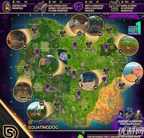 堡垒之夜梦魇挑战石像跳舞怎么过,堡垒之夜赛季任务玩法已经更新,相信不少小伙伴都发现梦魇挑战石像跳舞任务玩法需要寻找的梦魇挑战石像位置不知道在哪,下面小编就为大家分享下堡垒之夜梦魇挑战石像跳舞任务攻略。堡垒之夜梦魇挑战石像跳舞任务攻略如上图所示,梦魇挑战石像位置都已经标记出来需要到达地图上的不同石
