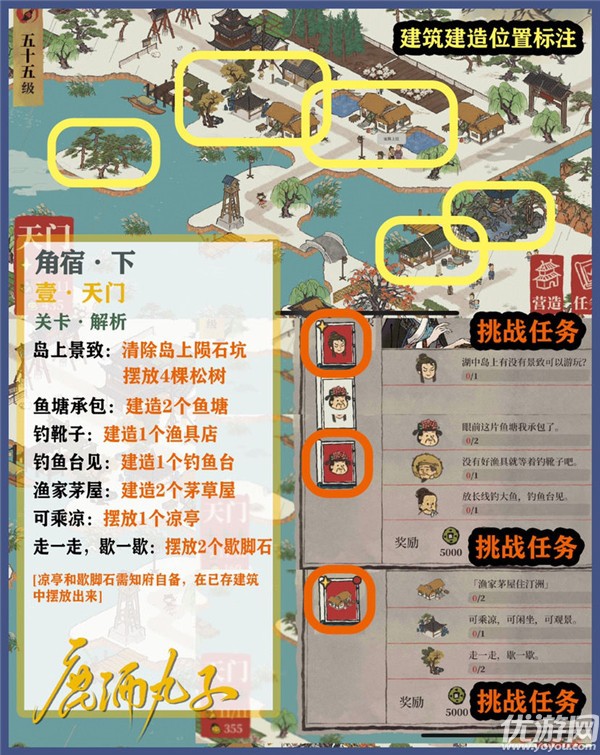 江南百景图角宿下怎么过?鸡鸣山中的星宿玩法目前只开放了2个关卡,其中第二关角宿下内附天门、平星、库楼、柱、衡、南门6个小关卡,下面就是江南百景图角宿下1-6关三星通关攻略了,一起来看看吧!江南百景图角宿下怎么过角宿·下壹·天门凉亭和歇脚石需要知府自备[凉亭可通过小贼/盐商兑换获得,歇脚石可通过盐商兑