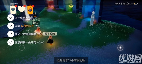 光遇4月2日每日任务怎么做?光遇国服今天可以接取的4个日常任务是:向一位玩家鞠躬、收集橙色光芒、净化10株黑暗植物、在禁阁赏一会儿花,下面就是光遇国服4.2今日任务速刷攻略了,小伙伴们一起来看看吧!光遇4月2日每日任务怎么做1、向一位玩家鞠躬;面向任意玩家做鞠躬动作(鞠躬动作常用第一个)。2、收集橙