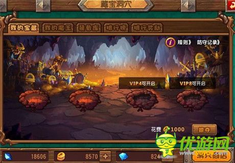 块块传奇藏宝洞穴怎么过;块块传奇藏宝洞穴通关攻略;点击屏幕右下方的“藏宝洞穴”按钮进入界面。每个人最多可以占领四个矿坑(后两个需要VIP才能开启呢),它们可是你魔石收入的唯一来源哟。点击“掠夺”你就能搜寻可供你占领的矿坑了,一共分三种效率:360/小时、720/小时、1080/小时。产矿效率越高的矿