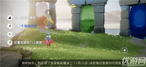 光遇6.24任务怎么做?光遇今天的日常任务是:向一位玩家鞠躬、收集蓝色光芒、面对冥龙和在霞光城拱门冥想。下面就是这些任务的完成攻略了,内附今日大蜡烛和季节蜡烛的位置,小伙伴们都来看看吧!光遇6.24任务怎么做今日任务1、「向一位玩家鞠躬」面向任意玩家做鞠躬动作。2、「收集蓝色光芒」霞谷溜冰场水底。3