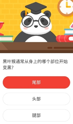 黑叶猴通常从身上的哪个部位开始变黑?尾部、头部、腿部。这是森林驿站8月30日森林小课堂的题目,黑叶猴幼崽体毛为灰褐色和橘黄色,那么它们是从尾部、头部还是腿部开始变黑的呢?小伙伴们一起来看看吧!森林驿站8月30日每日一题答案问题:黑叶猴通常从身上的哪个部位开始变黑?尾部头部腿部答案:尾部知识拓展黑叶猴
