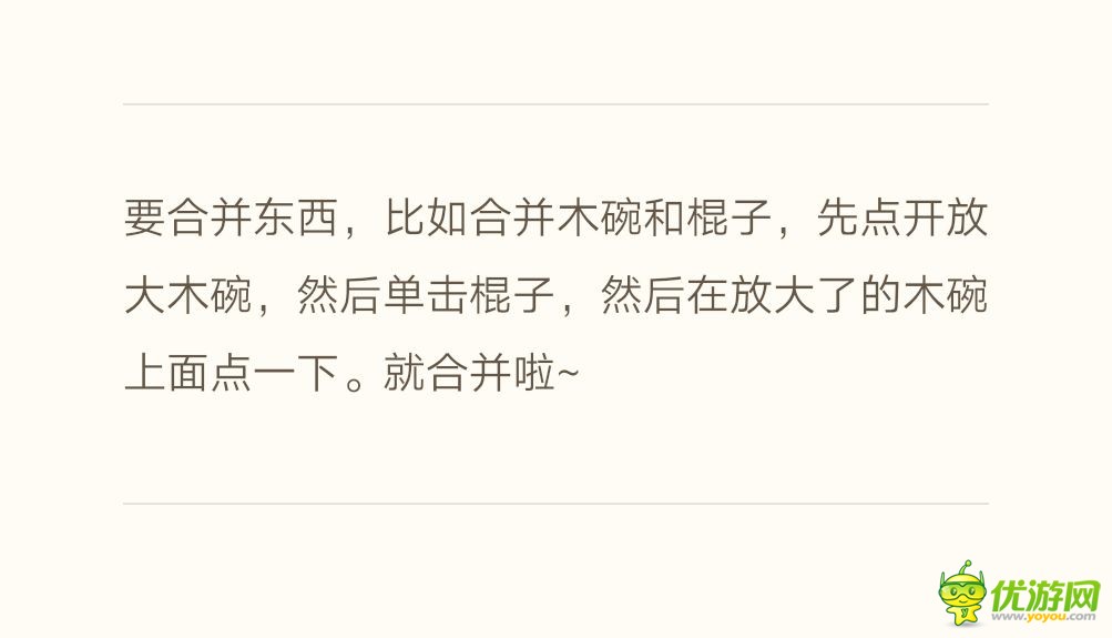 四目神组合物品攻略、接下来和小编一起看看要合并东西比如合并木碗和棍子,先点开放大木碗,然后单击棍子,然后在放大了的木碗上面点一下就合并啦