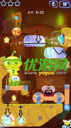 割绳子魔法第五章5-22关怎么通关;割绳子魔法第五章5-22关怎么过;割绳子魔法第五章5-22关通关攻略;先将线条1上面的冰块消除,当boss法力消失的时候立刻割断糖果的绳子,糖果可以凭借惯性吃到它左下方的星星后进入星河成功触发机关。接着将线条2上面的冰块消除,利用boss的法术将糖果吸引到这个小洞