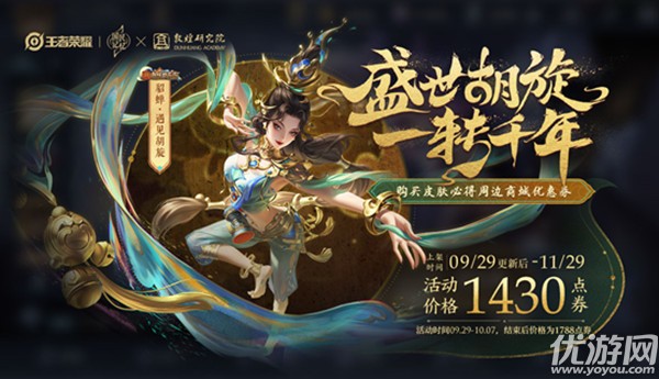 王者荣耀遇见胡旋什么时候出?敦煌系列第三款皮肤「貂蝉-遇见胡旋」会在9.29更新后上线,那么这款皮肤的售价是多少呢?这款皮肤是以莫高窟第220窟作品“唐韵胡风”为蓝本设计的,售价为1430点券,有兴趣的小伙伴们都来看看吧!王者荣耀遇见胡旋什么时候出心应弦,手应鼓,弦鼓声声,回雪转蓬——貂蝉-遇见胡旋