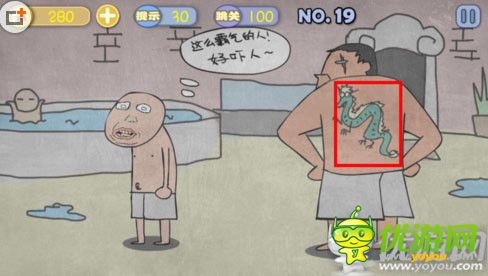 史上最贱暴走游戏第19关怎么通关;史上最贱暴走游戏第19关通关详细讲解;史上最贱暴走游戏第19关攻略;直接点他身上的那条小龙,点3次他就消失了!