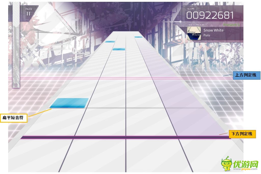 Arcaea游戏怎么玩?Arcaea游戏新手怎么操作?接下来小编为大家详解一下:1.点击操作游戏有上、下两条判定线。扁平短音符需要在与下方的判定线重合时点击,立体短音符需要在与上方判定线重合时点击2.长按操作遇到扁平长条形的音符时,需要从音符头一直长按至音符尾,以下方判定线为基准3.拖拉操作遇到立