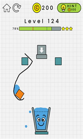 happyglass124关怎么过?小编相信很多玩家和小编一样都是觉得这关没有任何办法过关。其实这关并没有我们想的的那么麻烦,那么小编这就给大家介绍下怎么过?happyglass124关攻略在这一关我们会水杯上有2个木板盖着水杯,导致水无法流入水杯中。左上角还有一个可动小方块。这关只要我们阻止可动小