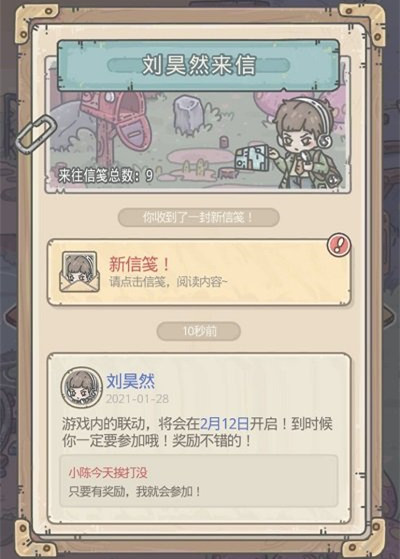最强蜗牛刘昊然彩蛋是什么?最强蜗牛近日公布了代言人,他们就是唐探二人组刘昊然与王宝强。玩家现在登录游戏还能收到刘昊然来信,这个就是官方给出的福利了。下面就让我们一起来看看最强蜗牛刘昊然彩蛋位置介绍吧!最强蜗牛刘昊然彩蛋是什么彩蛋介绍刘昊然是神秘代言人之一,在更新之后就会出现在玩家的邮箱中,完成对话即
