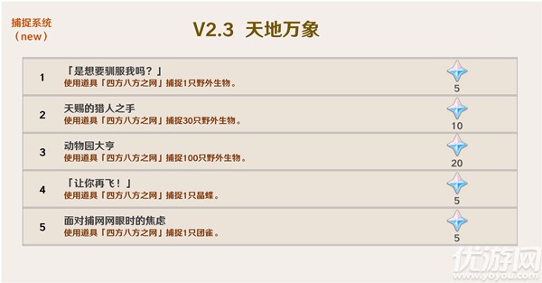 原神2.3版本中增加了很多成就,主要分为天地万象、boss成就和邀约成就,其中邀约成就非常简单,只要完成五郎和北斗的邀约任务就能达成,其他成就则需要完成对应任务。下面就是原神2.3版本新增成就达成条件介绍了,一起来看看吧!原神2.3版本成就大全天地万象①「是想要驯服我吗?」使用道具「四方八方之网」捕