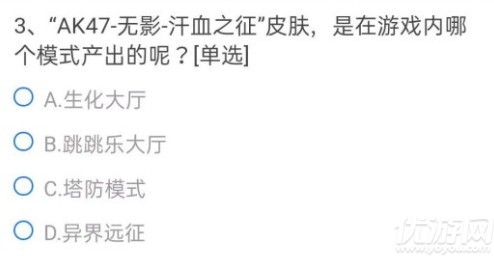 cf手游AK47无影汗血之征皮肤是在游戏内哪个模式产出的?这是穿越火线枪战王者7月体验服中的第三题,那么这款皮肤的产出模式是什么呢?接下来就让我们一起来看看cf手游7月体验服答案大全吧!cf手游AK47无影汗血之征皮肤是在游戏内哪个模式产出的问题:“AK47无影汗血之征”皮肤,是在游戏内哪个模式产出