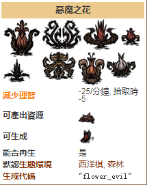 饥荒中恶魔之花是一种恶意生物,站在旁边都会掉理智,新手可能不知道这玩意有什么用,以及如何处理。今天小编就给大家讲讲恶魔之花的作用,有不清楚的小伙伴,一起来看看吧。恶魔之花:恶魔之花通常能在零件、麦斯威尔之门、活木附近可以大量找到的的花,摘取可以得到恶魔花瓣。恶魔之花跟一般的花一样,会生成蝴蝶并且能够