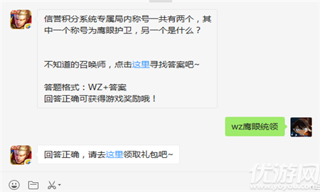 信誉积分系统专属局内称号一共有两个,其中一个称号为鹰眼护卫,另一个是什么?王者荣耀游戏中的信誉积分系统是十分关键的,友好游戏才能更好的体验竞技娱乐。下面小编就来给大家介绍下正确答案。2019王者荣耀1月11日题目信誉积分系统专属局内称号一共有两个,其中一个称号为鹰眼护卫,另一个是什么?(答题格式:W