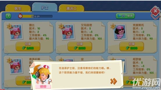 口袋医院护士怎么招募?口袋医院护士招募攻略、是不是还有好多小伙伴不知道呢?那些还知道的快来和小编一起看看吧招募一个护士点击招募——护士选项,界面如下:招募职员需要耗费一定的钱币,职员等级越高,能力越强,其所需的钱币越高。医术值:影响治疗病人的成功率;魅力值,影响病人的心情,魅力越高,病人越不容易离开