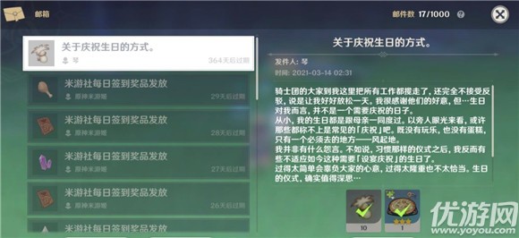 原神琴生日在哪?3月14日是琴的生日,按照惯例我们会收到琴的生日邮件,阅读之后还有礼物可以拿,这封邮件的名字叫做《关于庆祝生日的方式》,找到琴就能领取了哦!接下来就让我们一起来看看原神琴生日邮件奖励领取方法吧!原神琴生日在哪琴的位置:骑士团驻地「关于庆祝生日的方式」骑士团的大家到我这里把所有工作都揽