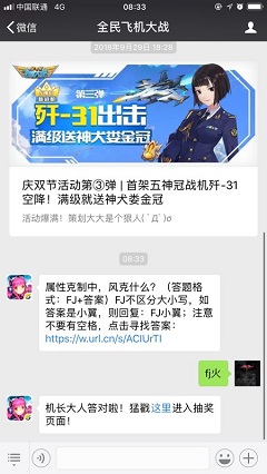 属性克制中,风克什么?全民飞机大战属性相生相克玩法许多玩家都不知道怎么操作,在游戏中玩家所选择的角色都会有属性玩法,今天的答案就和属性玩法有关,和小编来看看正确答案吧。2018全民飞机大战10月3日问题属性克制中,风克什么?(答题格式:FJ+答案)2018全民飞机大战10月3日答案答案:fj火