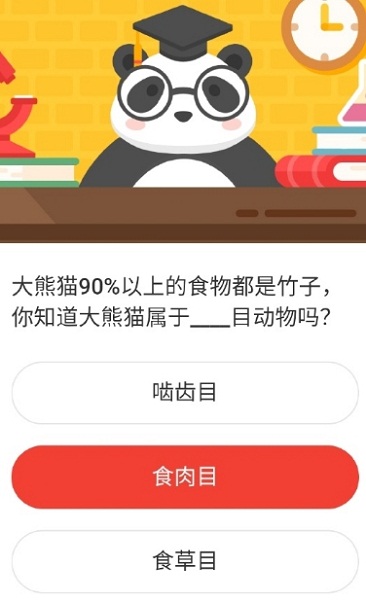 森林驿站小课堂4.24问题:大熊猫90%以上的食物都是竹子,你知道大熊猫属于目动物吗?这个问题一般网友可能都不太清楚,毕竟大家平时接触的不多,大家一起来来看看正确答案是什么吧。森林驿站小课堂4.24问题大熊猫90%以上的食物都是竹子,你知道大熊猫属于__目动物吗?啮齿目食肉目食草目森林驿站小课堂4.