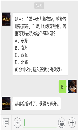 “掌中无力舞衣轻,剪断鲛鮹破春碧。”婉儿也想穿鲛绡,哪里可以去寻找这个织料呀?神都夜行录中有很多神话故事,这是今天神都夜行录中的每日一题。下面小编给大家公布下正确答案。题目:“掌中无力舞衣轻,剪断鲛鮹破春碧。”婉儿也想穿鲛绡,哪里可以去寻找这个织料呀?A、东海B、南海C、西海D、北海(5分钟之内输入
